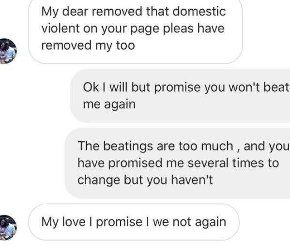 Lanre Gentry supposedly sent the message below asking her to remove the domestic violence posts from her Instagram page promising not to beat her again.