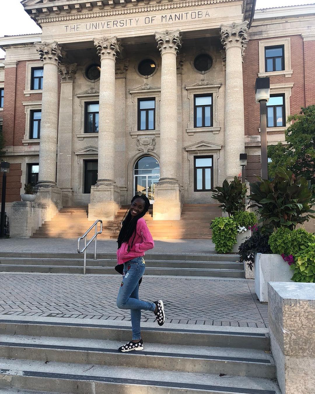 Her proud mother shared a photo of her which shows the teenager posing in front of a building that has the inscription, “The University of Manitoba”.