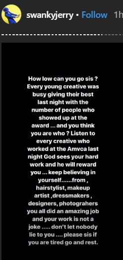 How low can you go sis? Every young creative was busy giving their best last night with the number of people who showed up at the award… and you think you are who? Listen to every creative who worked at the AMVCA last night God sees your hard work and he will reward you… keep believing in yourself…. from hairstylist, makeup artist, dressmakers, designers, photographers you all did an amazing job and your work is not a joke… don’t let nobody lie to you…. please sis if you are tired go and rest.