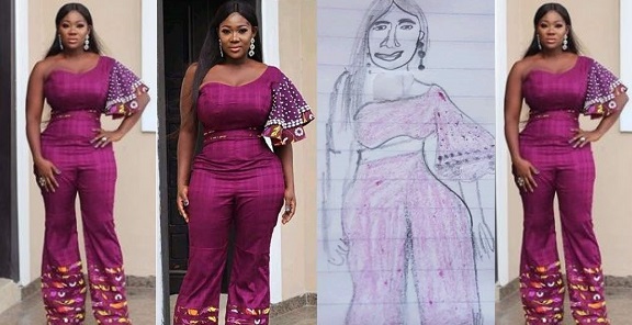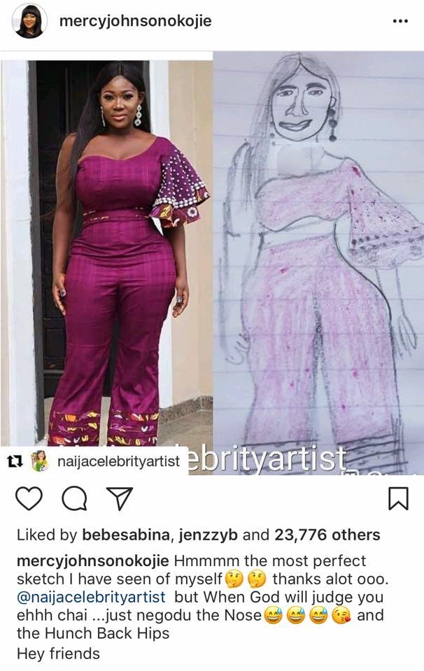 Delectable actress, and mother of 3, Mercy Johnson reacting to one of the drawing dedicated to her, said the sketch is perfect, and God of course will judge the artiste. Lol.