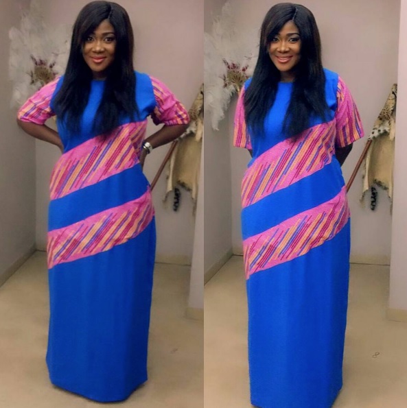 Mama bear Mercy can be seen donning a long blue maxi dress with double patterned pink stripes across the bodice, as she side-parts hair around her shoulders.
