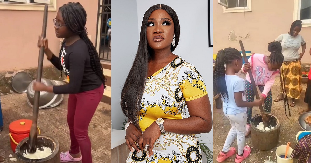 Popular Nollywood actress, Mercy Johnson Okojie, has has caused a stir on social media as she shares an adorable moment she teaches her children how to prepare and pound yam.