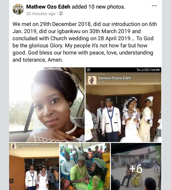 A Facebook user, Mathew Ozo Ede has shared how he and his wife got engaged only but few days after they met. According to the gentleman, he says their union is not based on how long they’ve spent together in courtship but how good.