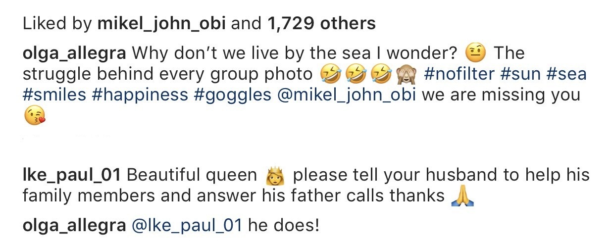 Olga, the Russian girlfriend of Nigerian footballer, Mikel Obi and mother of his twin daughters, has taken to his Instagram page to reply a man asking her to plead with Mikel to help his family.