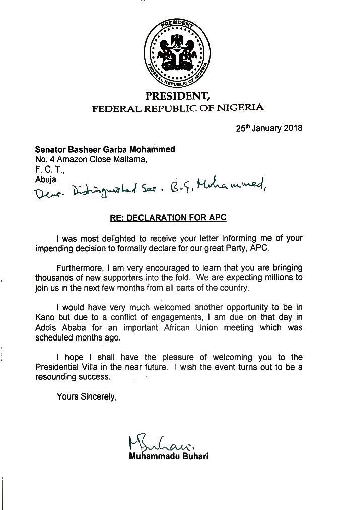 President Buhari in a letter has assured a Kano state lawmaker, Senator Basheer Mohammed who recently defected to APC that the ruling parting still has the backing of Nigerians.