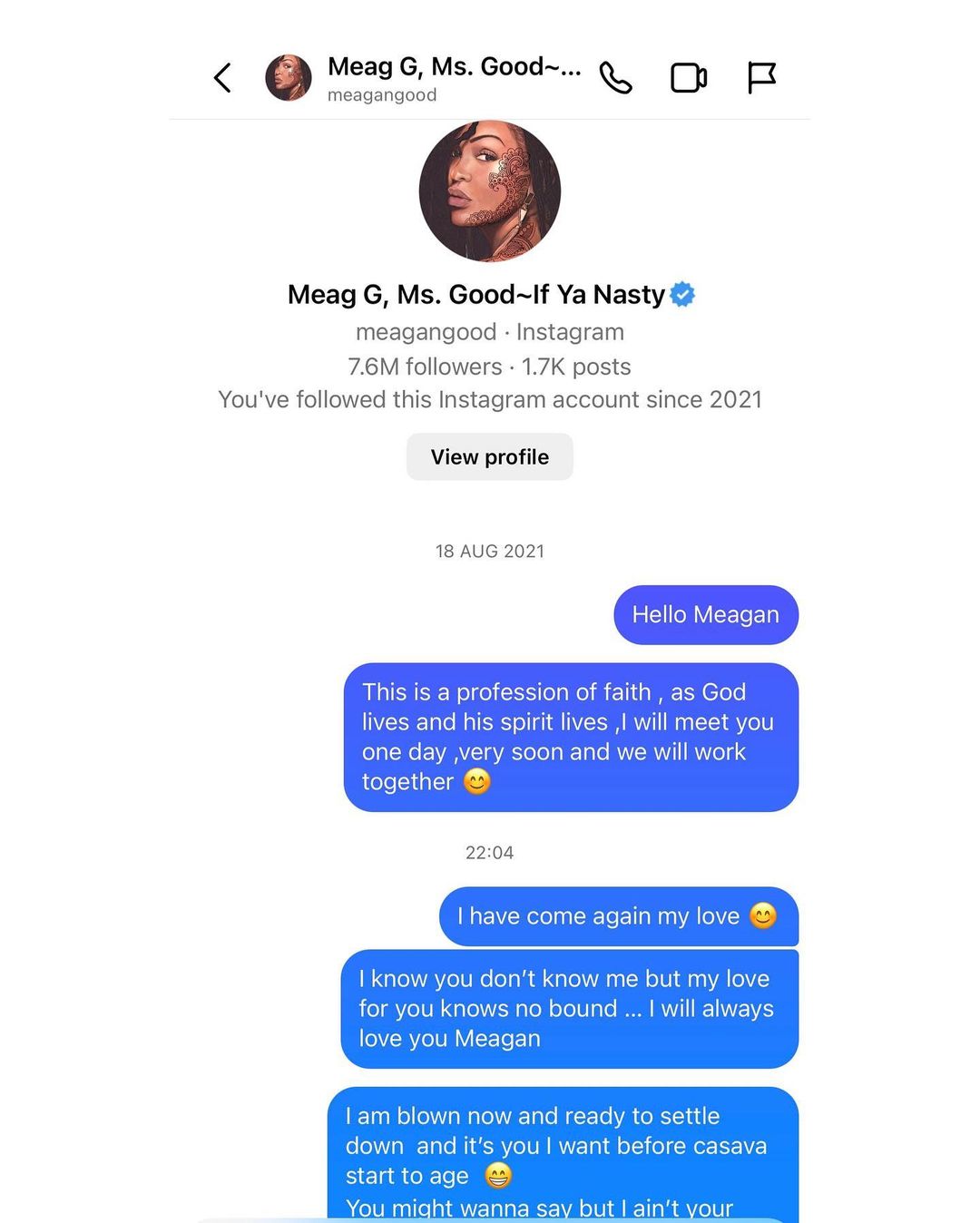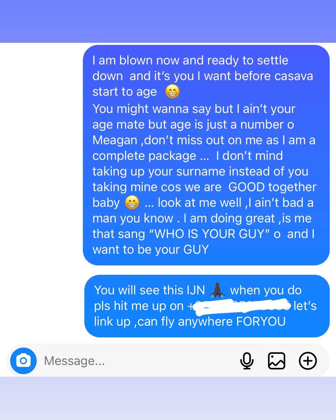 “You might wanna say but I ain’t your age mate but age is just a number o. Meagan ‚don’t miss out on me as I am a complete package. I don’t mind taking up your surname instead of you taking mine cos we are GOOD together baby & look at me well ‚I ain’t bad a man you know. I am doing great ,is me that sang “WHO IS YOUR GUY” o and I want to be your GUY. You will see this IJN, when you do. pls hit me up on +**** link up, can fly anywhere FOR YOU.” His message read.