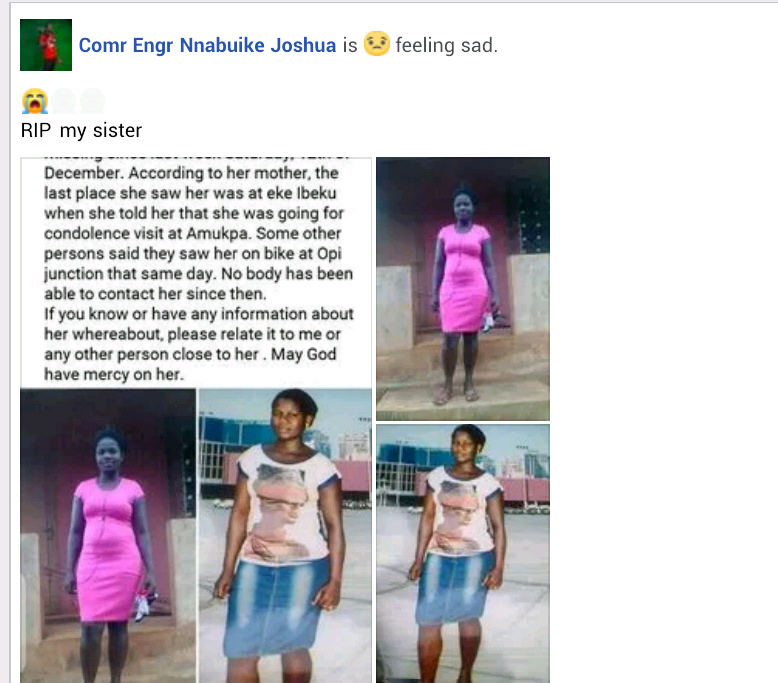 Rita who went missing December 12th when she went for a condolence visit at a neighboring village, Amukpa Ogbozala, Opi, was reportedly found dead on Saturday, December 19th, in the same community in Enugu state.
