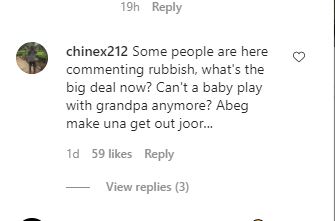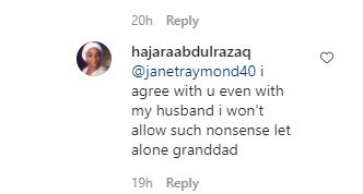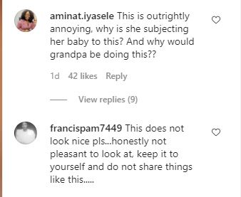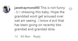 @janetraymond40 wrote, “This is not funny . U r stressing this baby. Hope the granddad wont get aroused over wat am seeing . I know d evil that has been going on recently btw grandad and grandad dota”.