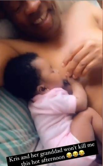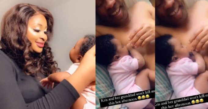 The actress who welcomed her baby in December 2020, had earlier taken to social media to share an adorable video of her daughter, Christabel, trying to suck her grandfather’s breast.