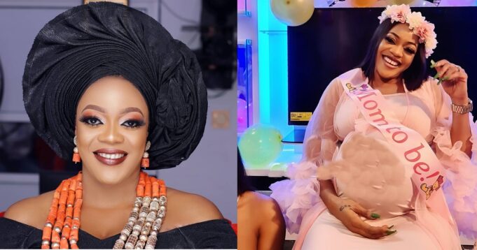 The Nollywood actress was clad in a baby pink attire with a sash across her body reading, “Mom to be.”