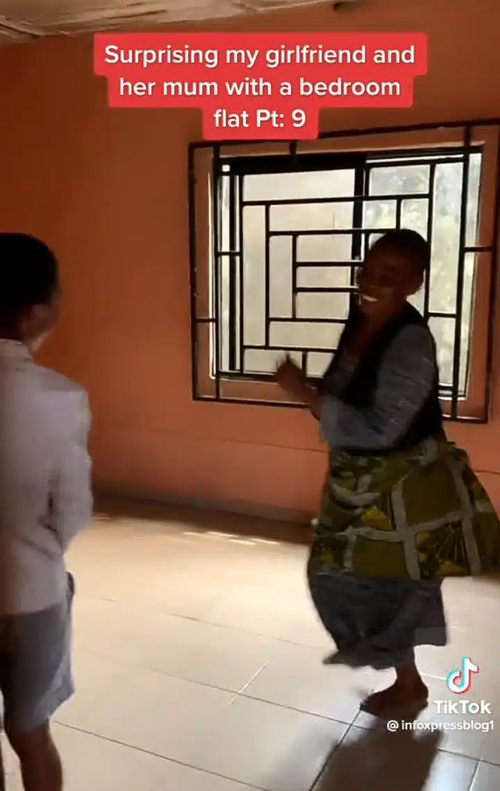 The elderly mother, who was delighted by the surprise, first danced happily around the new flat and then rolled on the floor as she expressed gratitude to God for blessing her through her daughter’s lover.