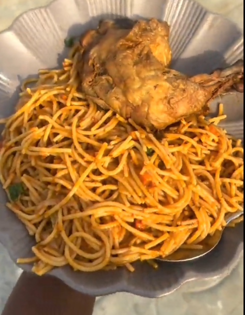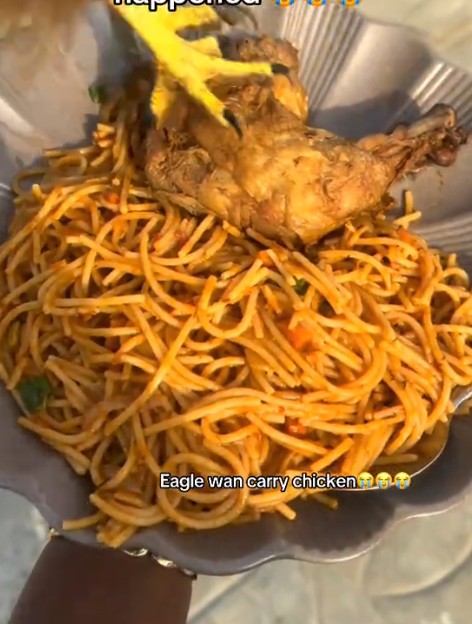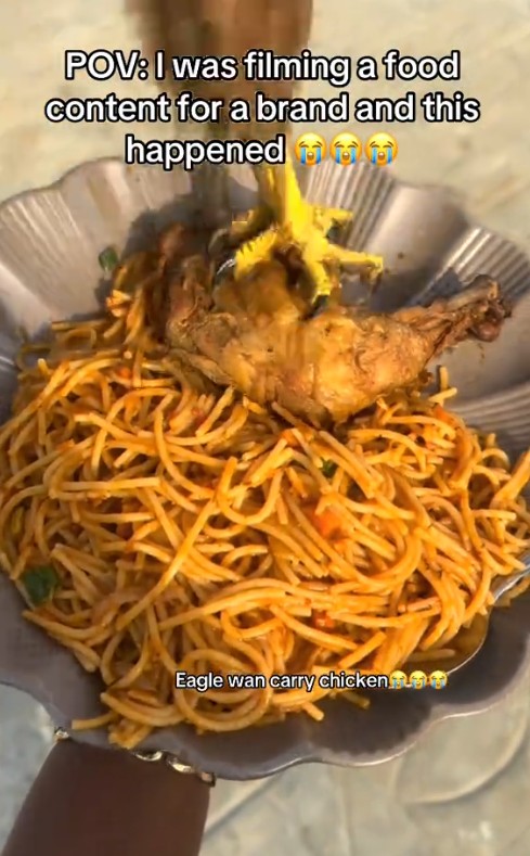 As seen in the video, she was calmly filming when a bird suddenly swooped in, targeting the chicken that accompanied her plate of spaghetti. The unexpected move caught her completely off guard.