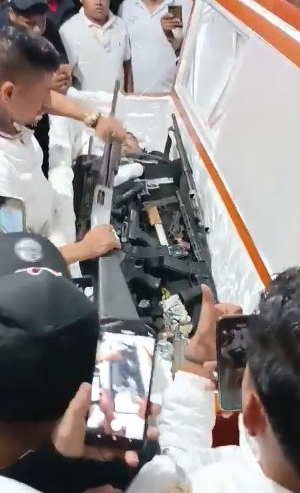 During his funeral, members of his cartel were captured on video placing an array of firearms inside his casket, as shared by an unnamed attendee.