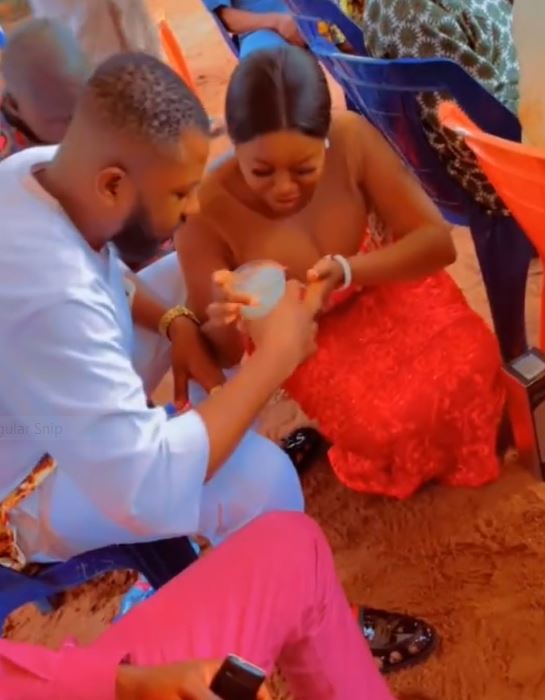 The video shows the couple surrounded by their family and friends as the bride presents the groom with a cup of palm wine, a common ritual in many Nigerian wedding ceremonies.