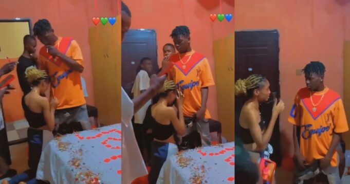 In the now viral video, the lady is seen kneeling before the guy who enters the room with some of his friends — she then somewhat bursts into tears while begging him. The person recording the video then beckons on the so-called boyfriend to hug his babe.