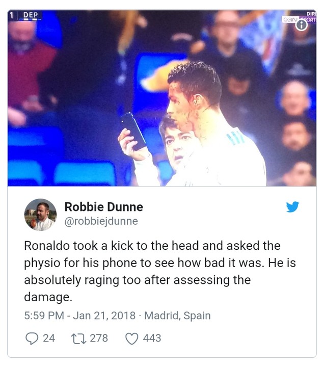 Real Madrid superstar Cristiano Ronaldo sustained an injury during a match with Deportivo that ended 7-1 in favour of Real Madrid.