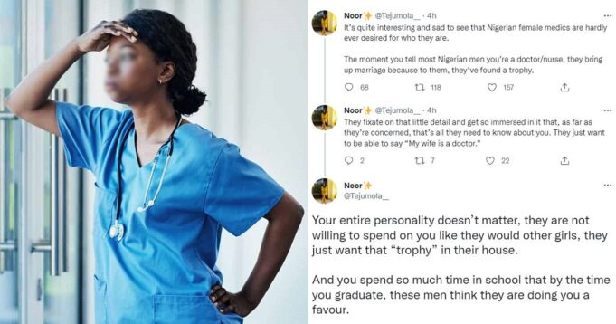 A Nigerian Twitter user has averred that female medics in Nigeria are “hardly ever desired for who they are” as most men want them just because of their profession.