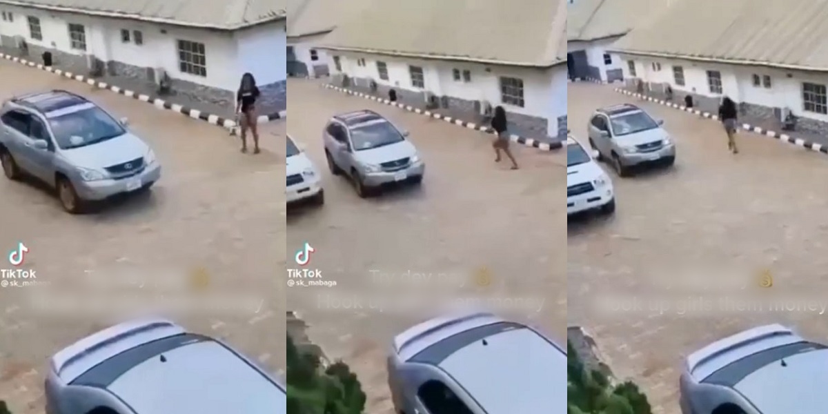 A Nigerian lady has been captured on camera racing against her client’s car at a lodging facility to stop him from leaving without paying for her service.