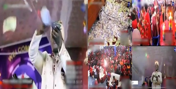 From the video, the Pastor is seen chanting and invoking for money whiles the members hold red burning candles and chanting along with him.