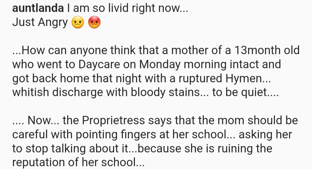 “A 13 months old baby abused in school. in school ooo! This defilement thing is getting crazier by the day! Pls see full video on @auntlanda page, am not livid to think straight!