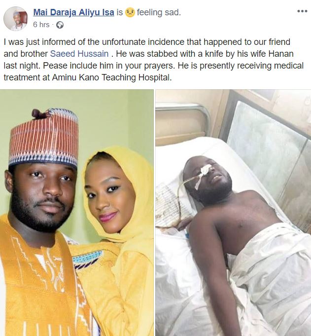 “I was just informed of the unfortunate incidence that happened to our friend and brother Saeed Hussain . He was stabbed with a knife by his wife Hanan last night. Pease include him in your prayers. He is presently receiving medical treatment at Aminu Kano Teaching Hospital.”