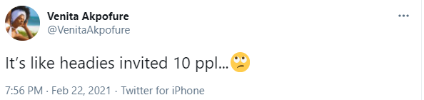 Sharing an observation she had from the show which held on Sunday, 21st February, 2021, Venita tweeted
