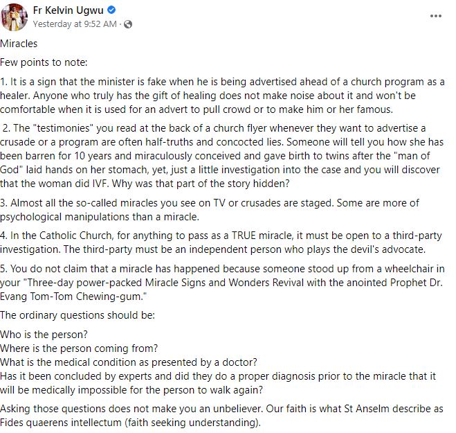 The priest stated this in a Facebook post on Thursday, February 3 while speaking on some of the signs to identify real miracles.