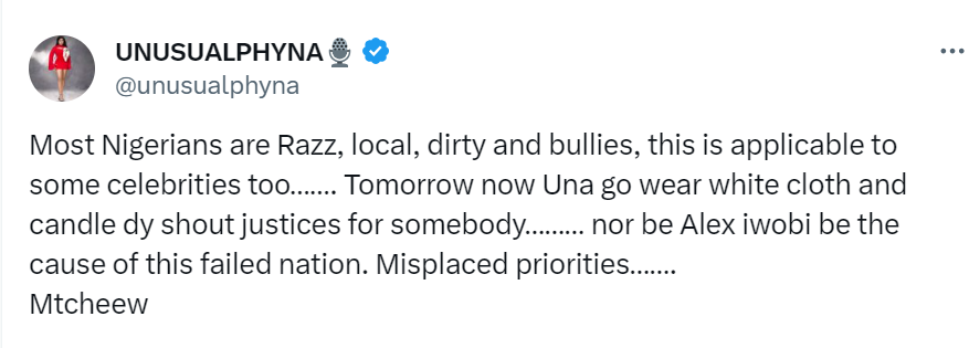 Most Nigerians are Razz, local, dirty and bullies, this is applicable to some celebrities too……. Tomorrow now Una go wear white cloth and candle dy shout justices for somebody……… nor be Alex Iwobi be the cause of this failed nation. Misplaced priorities…….”