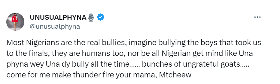 “Most Nigerians are the real bullies, imagine bullying the boys that took us to the finals, they are humans too, nor be all Nigerian get mind like Una phyna wey Una dy bully all the time…… bunches of ungrateful goats….. come for me make thunder fire your mama, Mtcheew”
