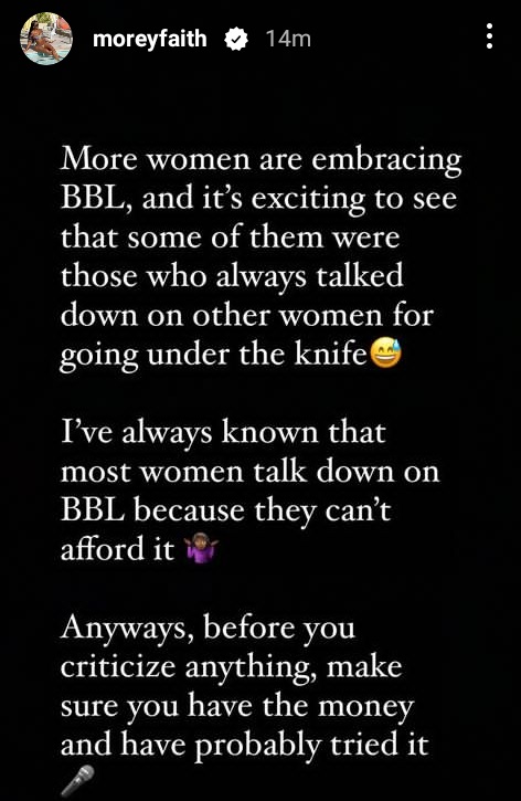 “I ‘ve always known that most women talk down on BBL because they can’t afford it. Anyways, before you criticise anything, make sure you have the money and have probably tried it.”