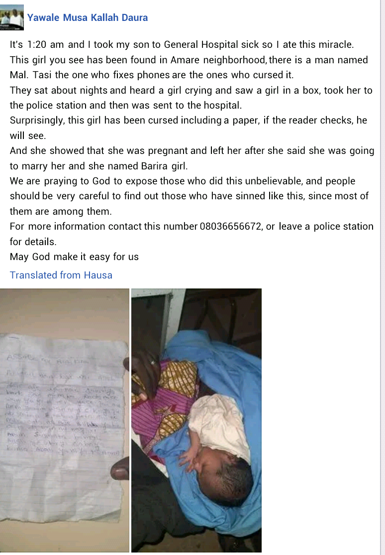 According to facebook user, Yawale Musa Kallah Daura, the baby was taken to the police station by the good samaritans who found her and later to the hospital.