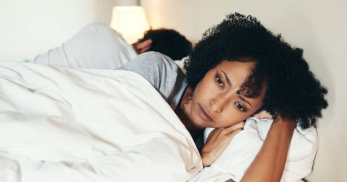 Shot of an attractive young woman lying with her back turned on her husband after an argument in their bedroom