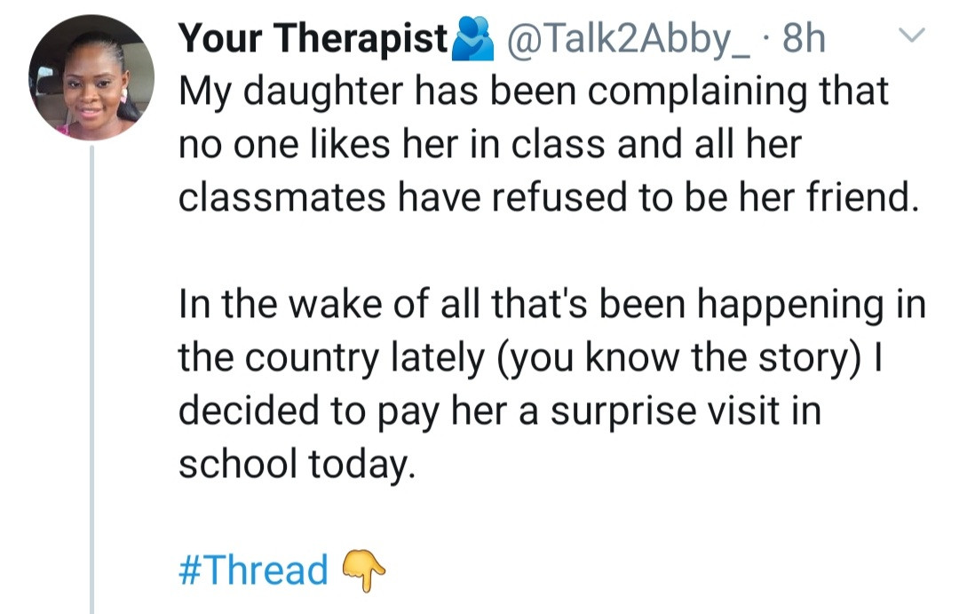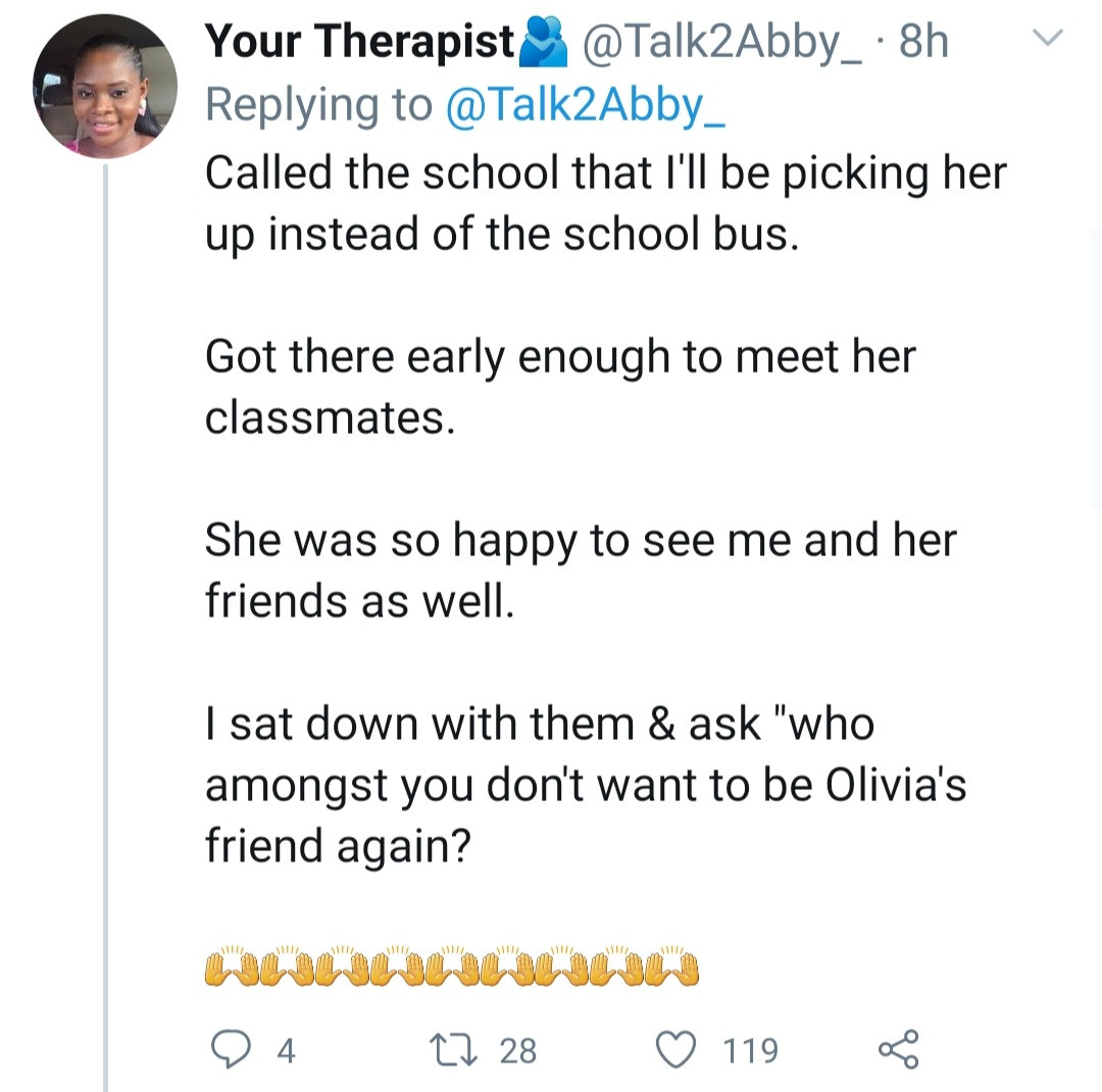 She said her daughter complained that no one wanted to be her friend at school, so she sprung into action and decided to visit her daughter’s school to know what the problem was. On getting to the school, she engaged her daughter’s classmates in a conversation.