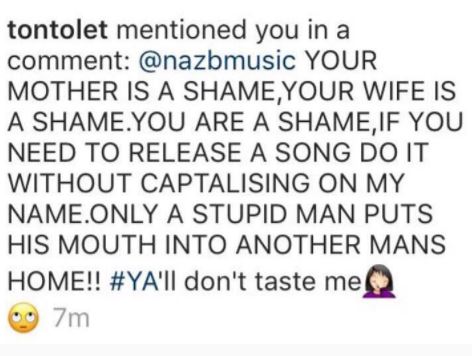The actress didn’t take his response lightly and she went all out to call him, his mum and even his wife ‘a shame’.