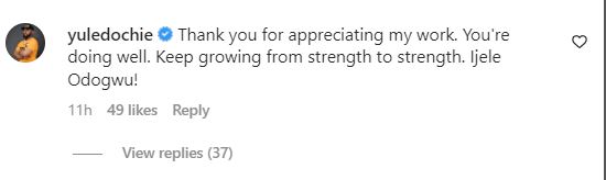 “Thank you for appreciating my work. You’re doing well. Keep growing from strength to strength. Ijele Odogwu!” He wrote.