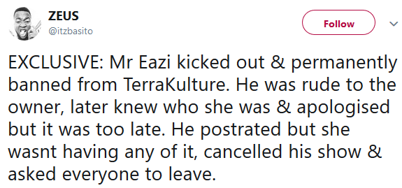 From the looks of things, he and the owner of the place, Bolanle Austen-Peters had a one on one and Mr Eazi disrespected her obviously not knowing who she was.