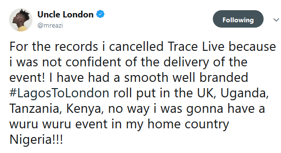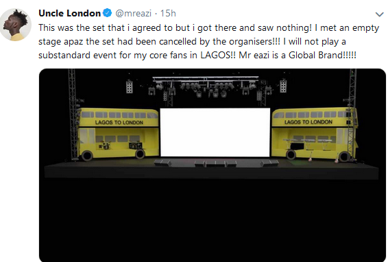 In a series of tweets, Eazi stated how he got to the event center and did not like the stage he saw there which was different from what he had asked for.