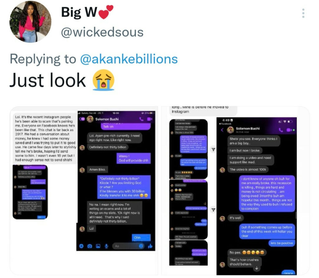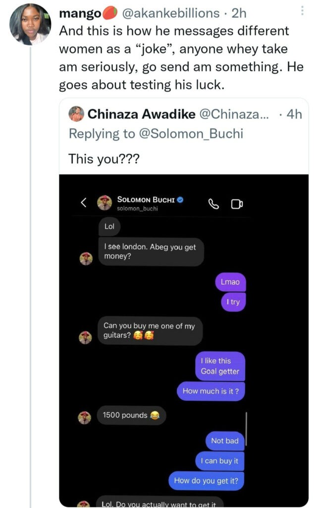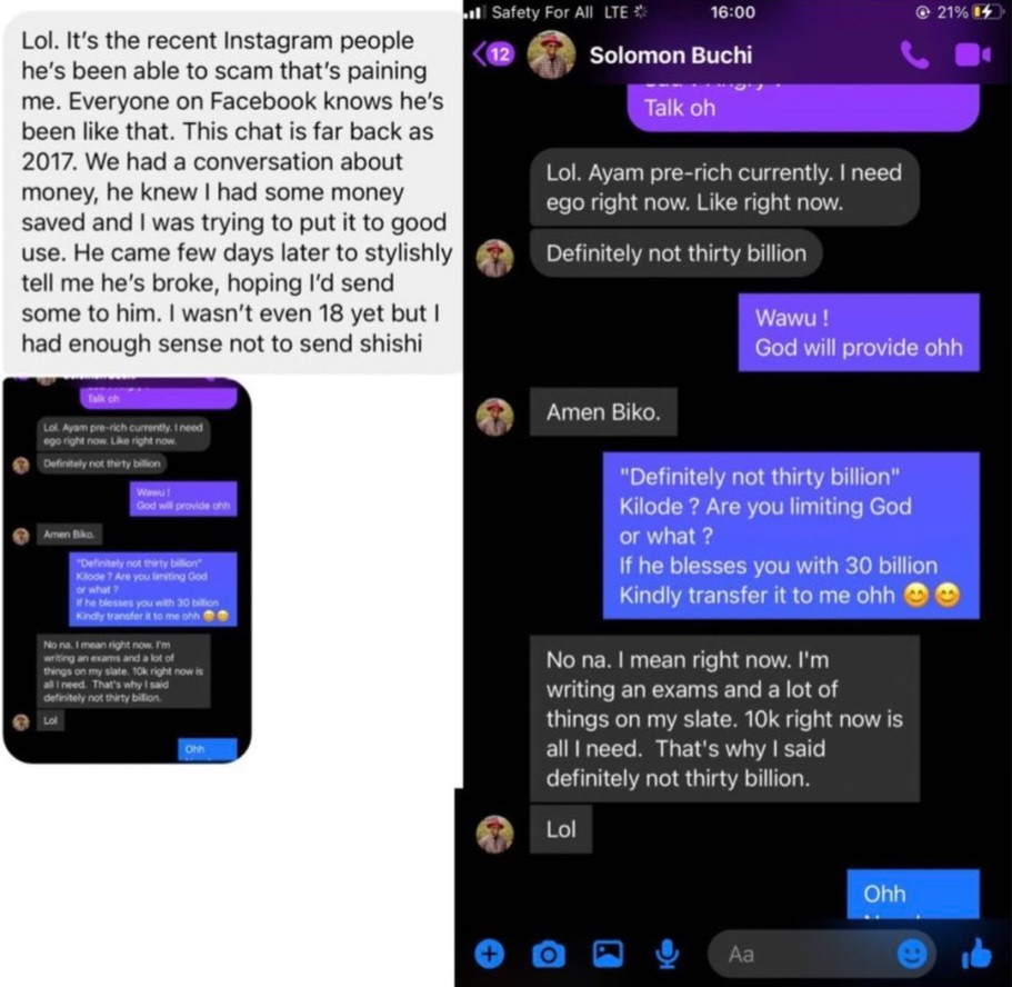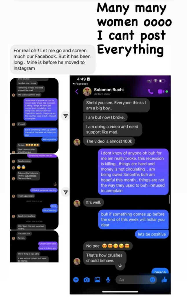 Amid the uproar caused by the tweet, some women began sharing chats purportedly showing Solomon Buchi stylishly begging them for money and material things.
