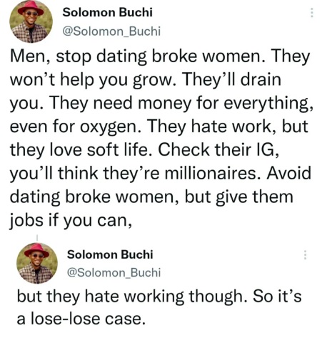 “Men, stop dating broke women. They won’t help you grow. They’ll drain you. They need money for everything, even for oxygen. They hate work, but they love soft life. Check their IG, you’ll think they’re millionaires. Avoid dating broke women, but give them jobs if you can, but they hate working though. So it’s a lose-lose case.”