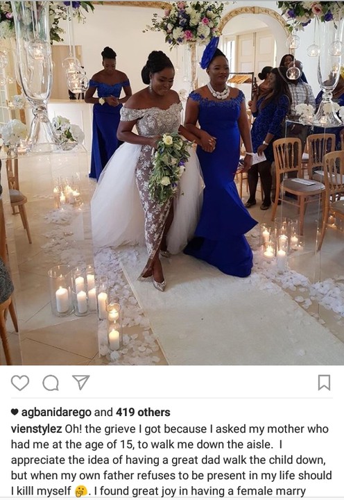 ‘Oh! the grieve I got because I asked my mother who had me at the age of 15, to walk me down the aisle. I appreciate the idea of having a great dad walk the child down, but when my own father refuses to be present in my life should I killl myself . I found great joy in having a female marry myself and an even greater joy honouring at vienstylezmum for doing her best in creating a better future for me. Cheers to the #motherofthebride.”