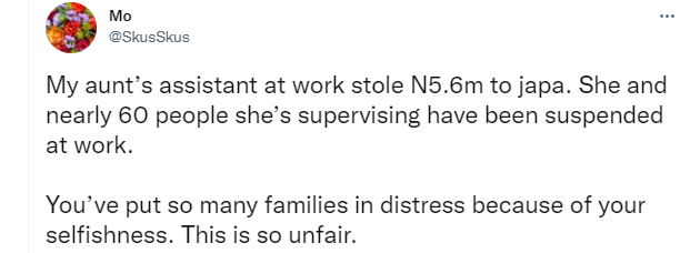 “My aunt’s assistant at work stole N5.6m to japa. She and nearly 60 people she’s supervising have been suspended at work.