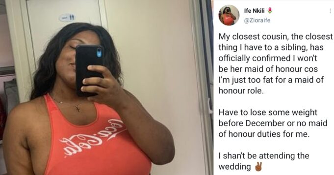 “My closest cousin, the closest thing I have to a sibling, has officially confirmed I won’t be her maid of honour cos I’m just too fat for a maid of honour role. Have to lose some weight before December or no maid of honour duties for me. I shan’t be attending the wedding” she tweeted on Sunday, June 5.