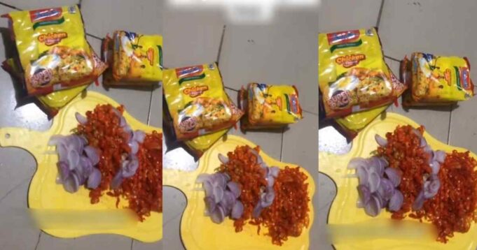 The viral clip recorded three packs of noodles and a cutting board filled with blended pepper and onions.