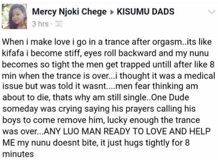 Oh my goodness! A Kenyan lady, Mercy Njoki Chege shared on Facebook what happens to her during and after sexual intercourse with men – according to her, it’s not medical issue and now she’s looking for the man who is “ready to help and love her”.