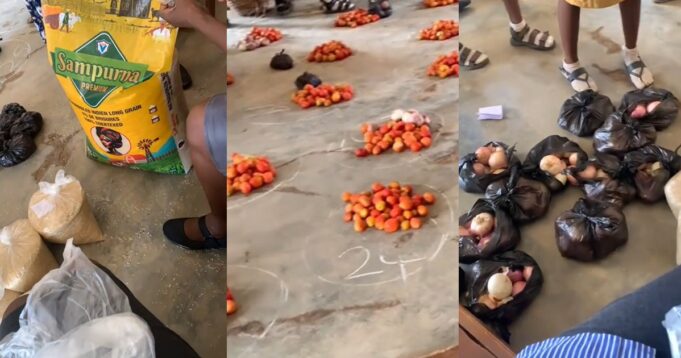 Aside from tomatoes, other food items included onions and rice. She recorded one of the teachers losing a bag of rice to share into smaller quantities for distribution.