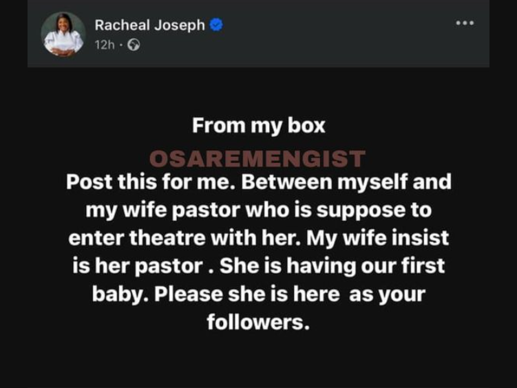 Shared by @Racheal Joseph on her Facebook account, the anonymous post questions the right a pastor has over a husband by staying with the wife while she is birthing their child.