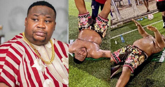 It appears he tried to lose some calories under the guidance of footballer, Emenike, but that exercise did not end well for him as he was filmed looking exasperated and sweaty.