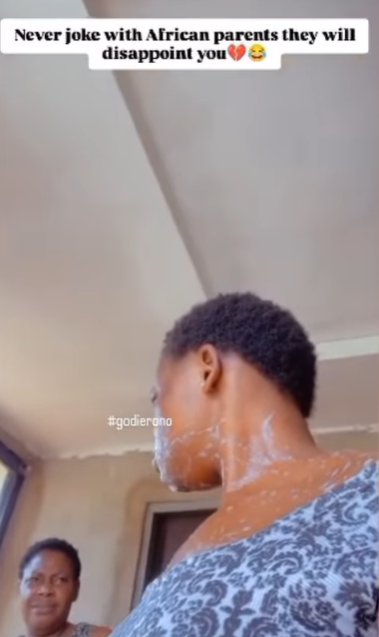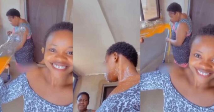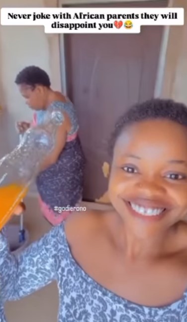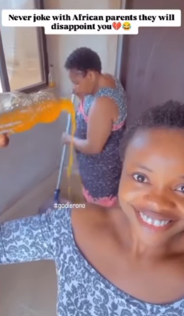 The mother immediately displayed the attitude of a strict African parent by using the wet mop stick to whip her daughter’s face as disciplinary action for disrupting her cleaning.