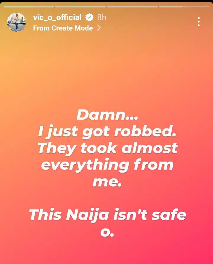 Popular singer and rapper, Victor Ncha Odu professionally known as Vic O has cried out after being robbed of nearly all his belongings.