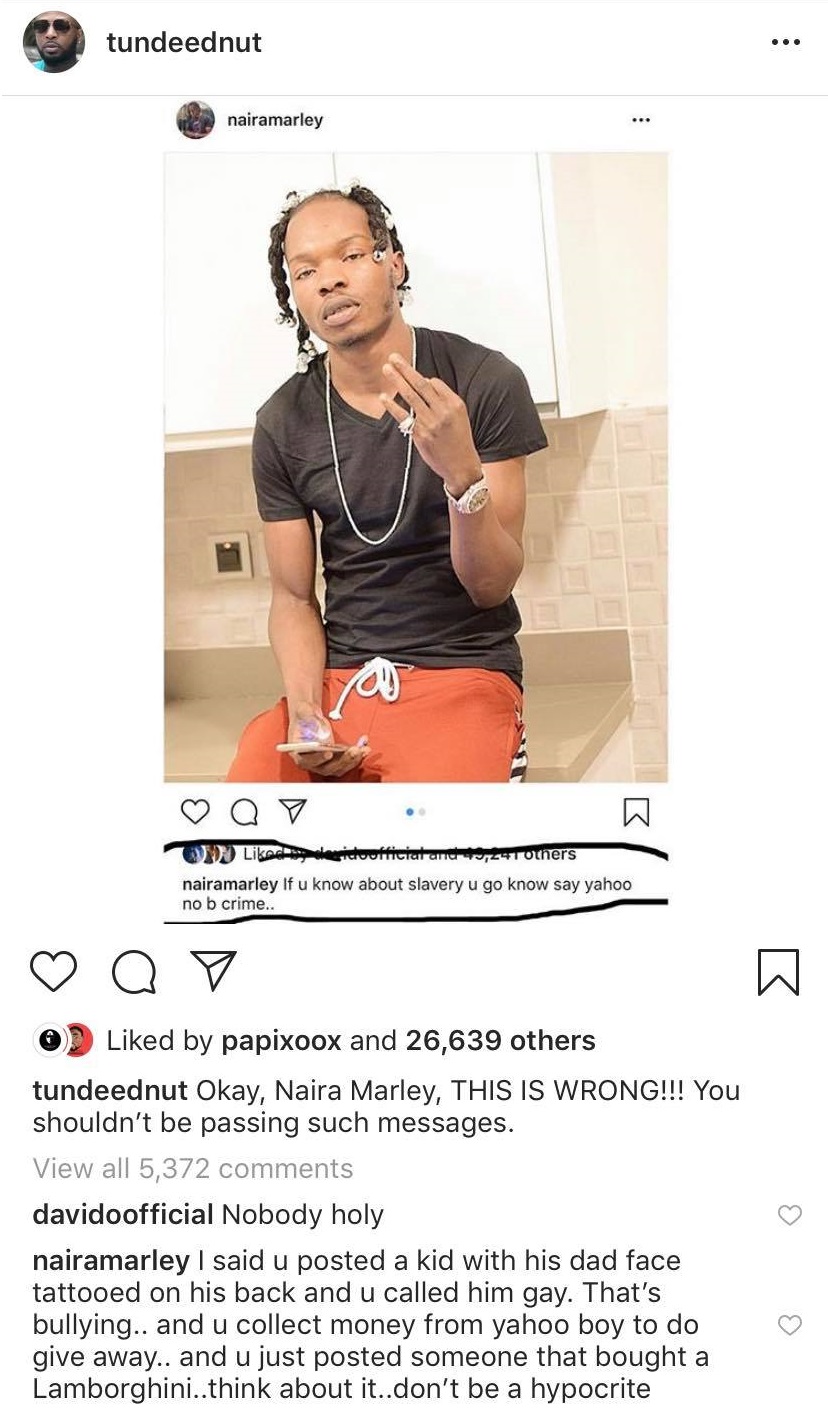 Instagram personality, Tunde Ednut was not left out, as he also berated the singer for his statement. Tunde wrote on his page; “Okay, Naira Marley, THIS IS WRONG!!! You shouldn’t be passing such messages.”